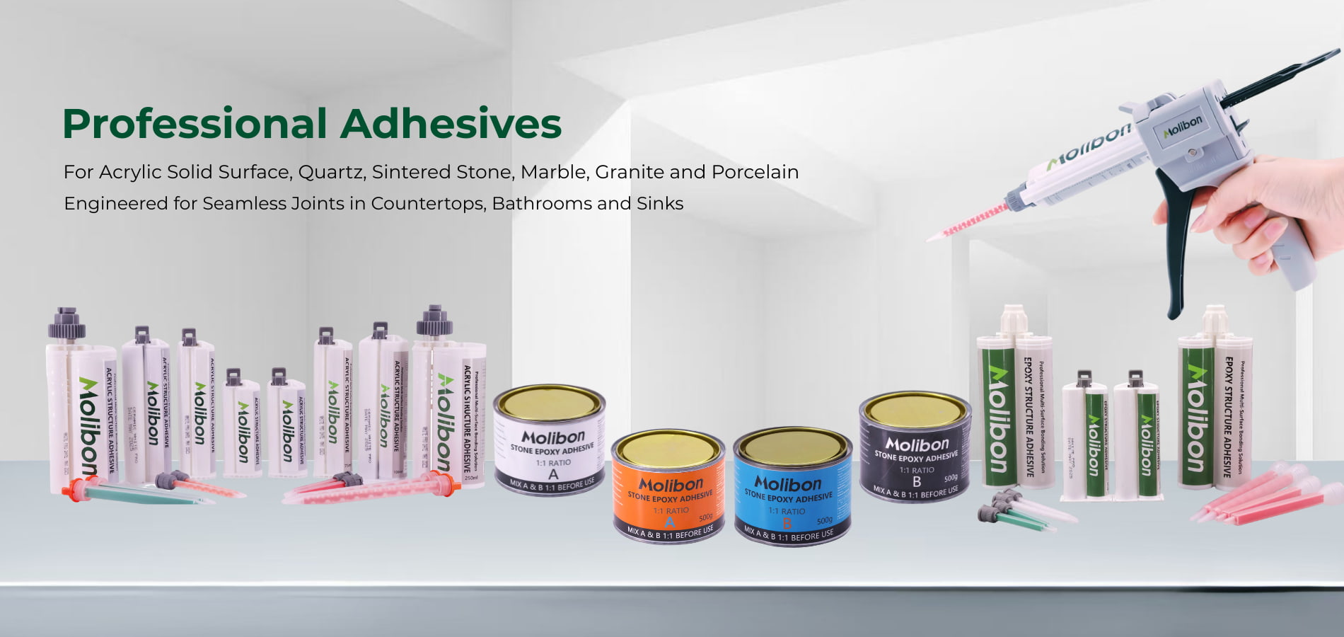 Xiamen Molibon Neue Materialien Co., Ltd. konzentriert sich auf die Forschung und Entwicklung sowie die Produktion von Industrieklebstoffen, mit Steinkleber als Schlüsselprodukt. Es wird häufig zum Verkleben von Quarz-Küchenarbeitsplatten, Kücheninseln mit fester Oberfläche, Arbeitsplatten aus Sinterstein, nahtlosen Waschbecken, Marmorarbeitsplatten und anderen Steinanwendungen verwendet.