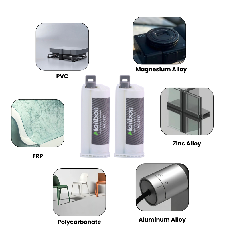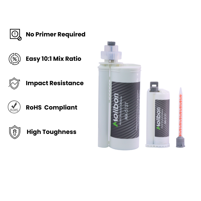 DerMehrkomponenten-AcrylklebstoffVerklebt eine Vielzahl von Materialien, von Metallen wie Aluminiumlegierungen und Edelstahl bis hin zu technischen Kunststoffen wie PC und ABS. Eine Grundierung ist nicht erforderlich.