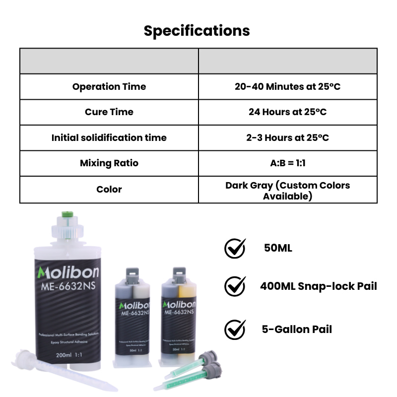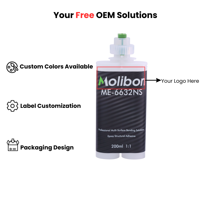 Molibon bietet Epoxidklebstoff Erhältlich in Standard-Eimern mit Schnappverschluss (50 ml und 400 ml) oder 5-Gallonen-Eimern. Sowohl die Farbe (Standard Schwarz/Weiß) als auch die Verpackung sind individuell anpassbar.